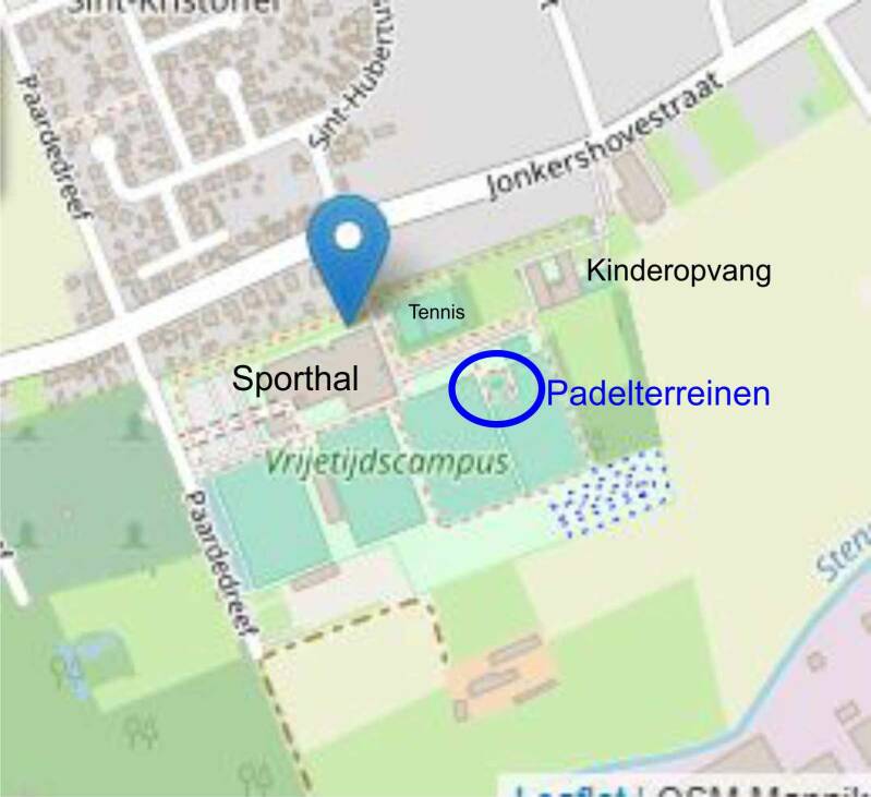 Hieronder vind je een plan van de vrijetijdscampus, met de padelterreinen in de blauwe cirkel.